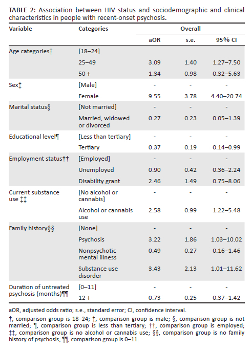 The association between HIV seropositivity and patient characteristics are presented in Table 2. The odds of being HIV positive were significantly higher for patients in the 25-49 age category (adjusted odds ratio [aOR] = 3.09, 95% CI 1.27-7.50), women (aOR = 9.55, 95% CI 4.40-20.74) and those who self-reported current alcohol and cannabis use (aOR = 3.43, 95% CI 1.01-11.62). A family history of psychosis (aOR = 3.22, 95% CI 1.03-10.02) also significantly increased the odds of living with HIV, while the odds of HIV were 63% lower for those who had a tertiary education compared with those who did not. There was no difference in the duration of untreated psychosis between the HIV-negative and -positive groups.