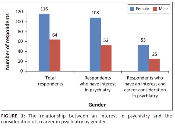 Figure 1 shows the relationship between an interest in psychiatry and the consideration of a career in psychiatry by gender. While females are more likely to have an interest in psychiatry (93% of females versus 81% of males), the proportion of respondents (49.1% female versus 48.1% male) considering it as a career path were similar. There was one female respondent who did not have an interest in psychiatry but would consider a career in psychiatry and thus the figure shows 53 and not 54 as expected.