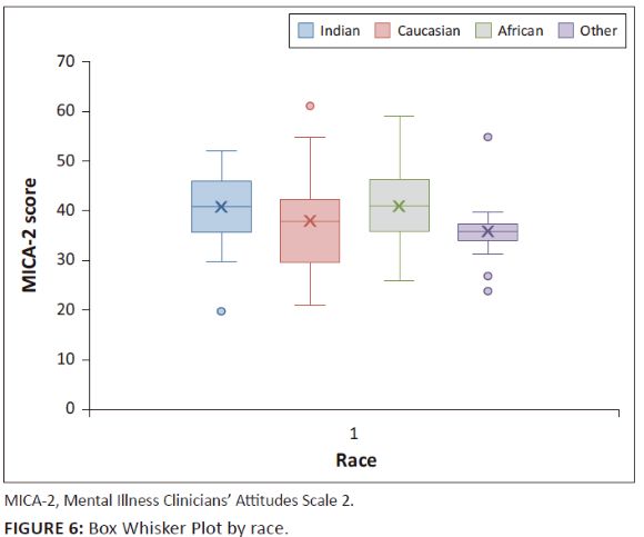 From Table 2 it can be concluded that there is a significant difference in the stigmatising attitudes towards mental illness and psychiatry between different race cohorts while age had no material impact. Figure 6 shows the Box Whisker Plots for the race questionnaire results. Care needs to be taken when analysing the other cohort as the data volume is low.