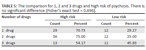 None of the demographic variables showed significant variations in the percentage of patients was found to be high risk versus low risk psychosis, including age (Fisher's exact test = 0.988), gender (Fisher's exact test = 0.556), marital status (Fisher's exact test = 0.755), level of schooling (Fisher's exact test = 0.716), employment status (Fisher's exact test = 0.117) and having a social grant (Fisher's exact test = 1.000) (Figure 1).