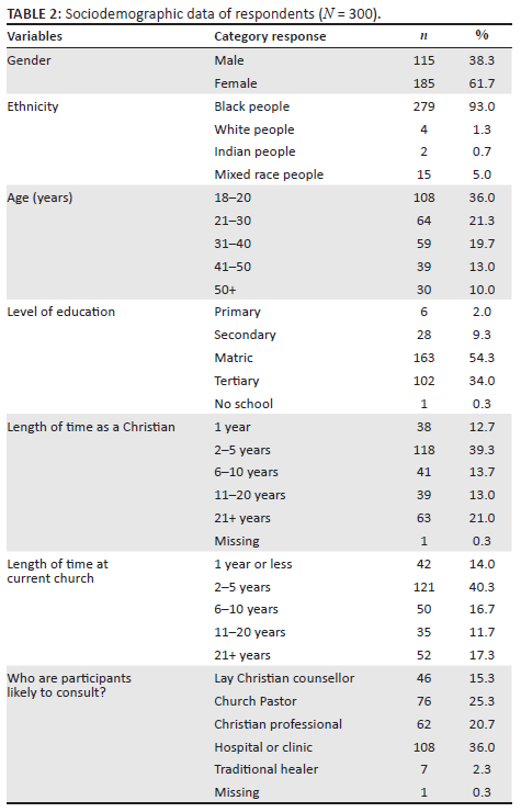 A total of 300 respondents met criteria and completed the questionnaires, of which 185 (61.7%) were female and 115 (38.3%) were male. The largest group of respondents were between 18 years and 20 years of age (n = 108, 36%), whereas only 10% of the group were over the age of 50 years. Most of the participants (n = 163, 54%) had completed high school while only one participant had no formal education. More than half of the respondents had been attending their current church for 5 years or less. The Sociodemographic data of respondents can be seen in Table 2.