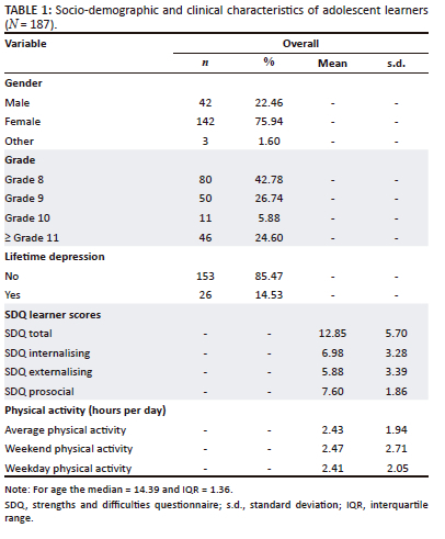 METHODS: A cross-sectional study was conducted among 187 adolescent learners (12-18 years) from three government schools in KwaZulu-Natal Province, South Africa, from January to March 2020. We fitted linear regression models between the Strengths and Difficulties Questionnaire scores (total, internalising, externalising, and prosocial) and hours of physical activity exposure, adjusting for demographic covariates, and depression history