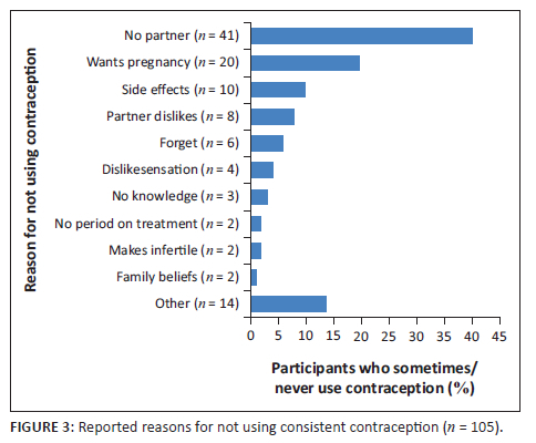 The commonest reason for not using contraception was not having a partner, accounting for 40.2% (n = 41) of women who did not use contraception (Figure 3). The second most common reason for non-use of contraception was the desire to fall pregnant, which accounted for 19.6% (n = 20) of women not using contraception (Figure 3). Desiring future children was, however, not associated with contraceptive use/non-use in the total sample (Fisher's exact test) (p = 0.122) (Table 1).