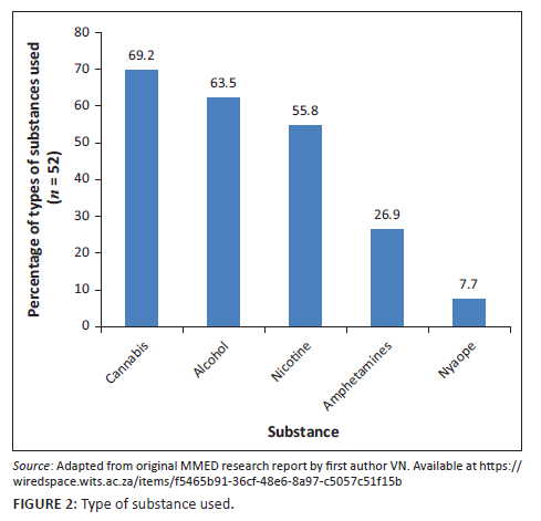 The lifetime prevalence of substance use as documented in the clinical record was 44.1% (n = 52) with the median age at first use of substances documented as 14 years (IQR [interquartile range] 13 years - 15 years). Of the patients reporting substance use, 46.2% (n = 24) were male and 53.8% (n = 28) were female. The median duration of substance use was 20 months with minimum duration of 1 month and maximum of 72 months (IQR 11-24 months). Most patients were introduced to substances by their peer group (n = 38, 86.4%). Cannabis was the most commonly used substance (n = 36, 69.2%), followed by alcohol (n = 33, 63.5%), nicotine (n = 29, 55.8%), amphetamines (including methamphetamine) (n = 14, 26.9%) and 'nyaope' (n = 4, 7.7%) (a mixture of cannabis and heroine and other substances, also known as 'sugars' or 'whoonga') (Figure 2). Substance use was not limited to one type of substance, and while 33% used only one substance, 67% used two or more substances.