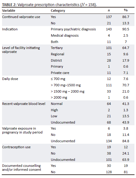 RESULTS: Of the 158 females who received valproate during the study period, 15 (9.5%) had it tapered off while 143 (90.5%) were continued. Only 19% of all the patients had documented counselling regarding valproate, 19 (12%) had documented contraceptive use, and six (3.8%) continued its use at any point during pregnancy. The most frequently prescribed dose range was 800 mg - 1499 mg/day (n = 111, 70.7%) and the most common psychiatric indication was a psychotic disorder.