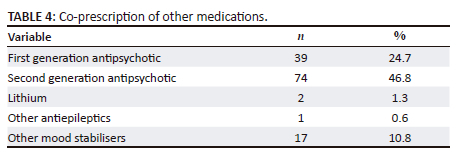 Of the 158 files, 157 (84.2%) had co-prescription of valproate with other medications (Table 4), of whom two (1.3%) were prescribed lithium, while 17 (10.8%) had other mood stabilisers. First generation antipsychotics accounted for 39 co-prescriptions (24.7%) and co-prescription of second-generation antipsychotics was noticed in 74 females (46.8%).