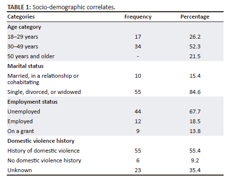 The mean age of the female accused referred for non-violent crimes was 39 years (standard deviation [s.d.]: 11.4) with the highest proportion in the 30-49 age group (52%), followed by the 18-29 age group (26%) and those aged 50 and above accounted for 22% of the sample. The minimum age was 19 years while the maximum age was 63 years. More than two-thirds (84.6%) of the sample were single, divorced, or widowed at the time of observation and 15.4% were married, cohabitating, or in a relationship. About 55% of the sample had a self-reported history of domestic violence or abuse whilst only 9% denied any prior history of domestic violence or abuse. A history of domestic violence or abuse was not documented in 35.4% of the sample. Regarding socio-economic status, 67.7% were unemployed whilst 18.5% were employed, and 13.8% received a grant. The socio-demographic correlates are summarised in Table 1.