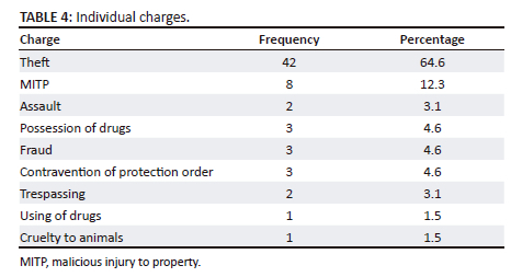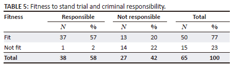 The charges were grouped into three categories: property crimes (theft, malicious injury to property [MITP], fraud, and trespassing), crimes against the person (assault, contravention of protection order, and culpable homicide), and crimes against the state (possession of drugs and cruelty to animals). A high number (83.1%) of the females accused were charged with property-related crimes followed by crimes against the person (9.2%). Crimes against the state were in the minority (7.7%). The two commonest individual charges (Table 4) were theft (64.6%) and MITP (12.3%). As illustrated in Table 5, the majority of the observandi were found criminally responsible (58%), whilst 42% were found not criminally responsible. The majority of the sample was found fit to stand trial (77%). Only 22% were found both not fit to stand trial and not criminally responsible.