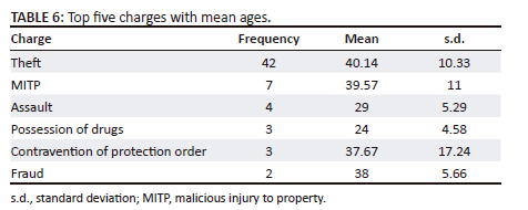 Table 6 shows the top five charges and the mean age for each charge. Theft had the highest mean (SD) age at 42 (SD: 10.33) and possession of drugs had the lowest at 24 (SD: 4.58). Logistic regression analysis which was conducted to examine the influence of age on charge category showed with statistical significance that an increase in age is associated with an increase in the probability that the female observandus was charged with a crime against the person (χ2(5) = 48.49, p < 0.001, n = 65). For crimes against the state, an increase in age was associated with a decrease in the probability that the observandi were charged with a crime against the state (χ2(1) = 7.51, p = 0.006, n = 65). Regarding crimes against the person, there was a statistically significant probability that the observandi were charged with a property-related crime with increasing age (χ2(1) = 8.16, p = 0.004, n = 65).