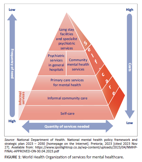 Almost a decade later, the National Mental Health Policy Framework and Strategic Plan 2013-2020 (NMHPF) outlined a 12-point action plan to address persistent inadequate and inequitable mental healthcare services in South Africa.2 The same 12 areas for action are detailed in the updated National Mental Health Policy Framework and Strategic Plan 2023-2030.3 These actions are as follows: (1) services should be organised to align with World Health Organization (WHO) recommendations, (2) the mental healthcare system should be monitored and evaluated, and (3) psychotropic medicines would be available at all service levels in accordance with the standard treatment guidelines and essential medicines list.