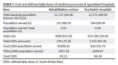 The specialised hospitals serve the entire Gauteng population, taking referrals from general healthcare facilities. They are separated into two groups: rehabilitation centres and psychiatric hospitals (Table 5). Being specialised, both groups served a very small number of people. While the high cost/1000 population served at psychiatric hospitals is related to the entire patient population being treated for MNS disorders, the high cost/DDD means that the use of more expensive medicines is a contributing factor.