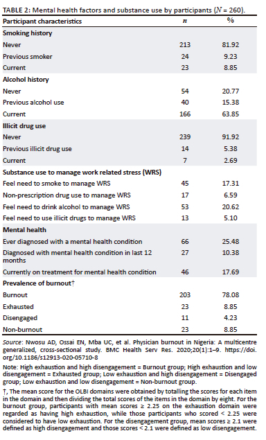 This study supports evidence from previous studies3,18,44 that showed no significant association between burnout and sociodemographic factors such as age, gender, relationship status, and being the primary caregiver of children or elderly or disabled family members. This corroborates the suggestion that the source of burnout resides in contextual factors and is independent of individual factors.3 Furthermore, a strong association between burnout and being a junior doctor was shown. This concurs with evidence that found burnout to be an early career phenomenon,42 with junior doctors experiencing an increased risk of burnout compared to their senior peers, because of inexperience in handling occupational stressors in an overburdened health system.43,44,45,46,47 It may also be likely that, in this study, burnout was not related to income band but was rather a function of the participants junior status. About a quarter of the participants (21%) used alcohol to manage WRS and feeling the need to use alcohol was associated with an increased risk of burnout. Since this study was cross-sectional in design, it is unclear whether alcohol use preceded or followed burnout. However, it is possible that participants were using alcohol, as a maladaptive coping mechanism, to ease the stressors associated with burnout.19,48,49,50
