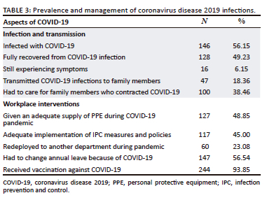 The evaluation of COVID-19 impacts revealed that over half of the participants had been infected with COVID-19 (56%). A small number of the participants (6%) were still experiencing symptoms, with almost half (49%) reporting a full recovery. Some participants reported transmitting COVID-19 to family members (18%) and 38% had to care for family members who had contracted COVID-19. Workplace interventions to mitigate COVID-19 risk such as the adequate supply of PPE (49%) and adequate implementation of IPC measures and policies in their workplaces (45%) were also reported, with majority (93%) also having received vaccination against COVID-19 (Table 3).