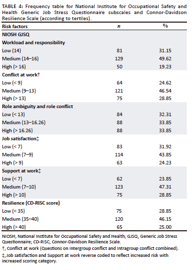 Half of the participants (50%) experienced medium levels of workload and responsibility. Over a quarter of the participants (29%) experienced high levels of conflict at work and a third (34%) experienced high levels of role ambiguity and role conflict. Low job satisfaction (32%) and low levels of support (24%) were also reported. Based on the CD-RISC score, 25% of the participants had high levels of resilience while 46% had medium resilience and the remaining quarter had low levels of resilience (Table 4).