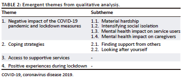 The majority of service user and caregiver participants described material hardship caused by lockdown. Most reported being sustained (pre-COVID and during lockdown) by government grants (e.g. disability grant, elderly persons' grant). Financial effects included difficulty repaying loans. A minority described the negative financial impact of buying alcohol and cigarettes on the black market. Some caregiver participants experienced job losses (ad-hoc daily 'piece work') or reduced working days (e.g. domestic workers). Food insecurity was an important stressor for caregivers who shouldered responsibility for providing sufficient food for their whole household. A subgroup of caregiver and service user participants voiced disappointment at being excluded from government COVID-19 relief grants and food parcels: