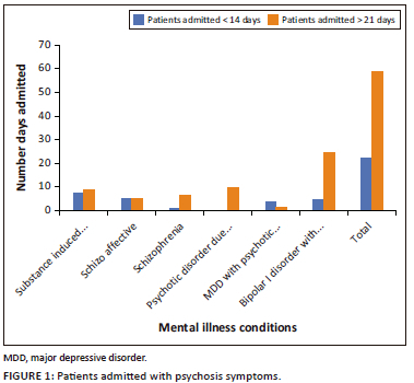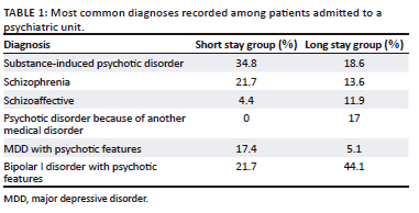 Shorter stays in psychiatry wards at SBAH were associated with younger males presenting with conditions that require rapid stabilisation. Long stay was found to be associated with older females with primary psychotic disorders and comorbidities. In this setting, a digital system that records data to avoid missing files and loss of information is needed. Although deinstitutionalisation remains a challenge in South Africa, patients' family members assist with continuation of care; hence, 95% of patients in the SSG had family support.