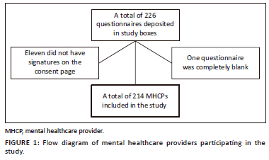 The study population consisted of MHCPs who form part of the psychiatric multidisciplinary team (MDT) working at the above-named hospitals. Convenience sampling was used. All MHCPs who provided informed consent to participate in the study, and who completed the study questionnaire, were included. Study questionnaires were distributed to MHCPs and, to ensure anonymity, were deposited upon completion into sealed boxes at the various sites.