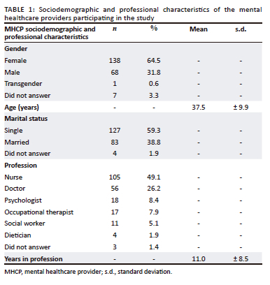 A total of 214 participants, across the five study sites, were included in the study (Figure 1). The characteristics of the MHCPs who participated in the study are shown in Table 1.