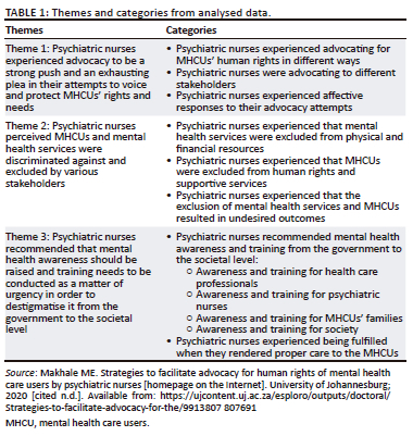 This study aimed to explore and describe psychiatric nurses' lived experiences in advocating for the human rights of MHCUs in the Gauteng province. A summary of the themes and categories that were identified from the analysis is presented in Table 1.33