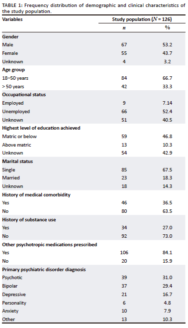The study population comprised 126 patients, 25 each from Discoverers, Crosby, Zola, and Hillbrow psychiatric clinics, and 26 from Eldorado Park Ext 8 psychiatric clinic. The demographic and clinical characteristics are presented in Table 1.