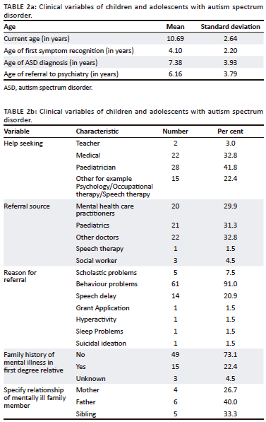 The mean and s.d. for the current age of the child (in years) was 10.69 (s.d. 2.64) years (Table 2), while the median and interquartile range (IQR) was 10 (9.0-12.0) years. The mean age of first symptom recognition by parent/caregiver was 4.10 years (s.d. 2.20), referral to psychiatry was 6.16 years (s.d. 3.79), and at first diagnosis of ASD was 7.38 years (s.d. 3.93). Help-seeking was mainly at paediatric medical services (n = 28, 41.8%) followed by general medical services (n = 22, 32.8%), with the main referrals being from mental health care practitioners (n = 20, 29.9%), paediatrics (n = 21, 31.3%), and other doctors (n = 22, 32.8%). The main reason for referral was behavioural problems (n = 61, 91.0%). In addition, 49 (73.1%) patients indicated that there was no history of mental illness in first degree relatives.