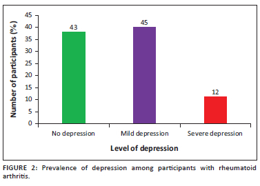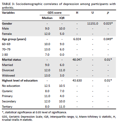 RESULTS: The mean age (± standard deviation [s.d.]) was 66.6 (± 5.5) years, with males constituting 57.5%. The prevalence of depression was 57.8%. Osteoarthritis 30.2%, while 69.8% had rheumatoid arthritis. Sociodemographic factors associated with depression include age (p = 0.049), marital status (p = 0.001), and level of education (p = 0.001). Duration of illness (p = 0.02), hospitalisation (p = 0.03), and number of medications (p = 0.01) were clinical factors associated with depression score
