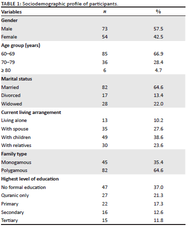 A total of 127 older adults participated in the survey. The age range was 60-82 years, with a median age (interquartile range [IQR]) of 66.0 (± 8.0) years (see Table 1). The mean age (± standard deviation [s.d.]) was 66.6 (± 5.5) years. About 85 (66.9%) participants were aged between 60 and 69 years, with male predominance constituting 73 (57.5%).