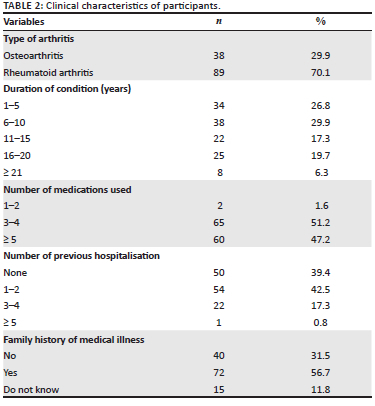 Among the 127 participants, osteoarthritis was present in 38 (29.9%), while 89 (70.1%) had rheumatoid arthritis (see Table 2). Of the total participants, 72 (56.7%) have been suffering from arthritis for 10 years or less, with 77 (60.8%) previously admitted for medical condition, while 65 (51.2%) were using between 3 and 4 medications for the arthritis.