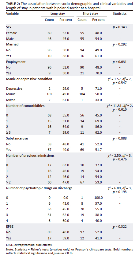 Employment was a significant predictor of LOS; employed patients had shorter stays than those not employed. These findings were congruent with those of a study conducted in China, which found that unemployment was associated with prolonged LOS.24 This finding has several potential reasons: Firstly, employment indicates high psychosocial functioning in patients with BD.31 This is a good prognostic indicator for recovery. Secondly, the symptoms of employed individuals may be detected earlier (because of impairment in functioning and alterations in behaviour), allowing timeous treatment seeking, which can minimise the length of stay. However, this was not found in the Nigerian study, where employment was not associated with LOS.30 The study conducted by Adegunloye did not focus specifically on patients admitted with BD, and more than half (i.e., 55.0%) of their patients were diagnosed with schizophrenia.30 Therefore, the results of their study may not be directly generalisable to this study population.