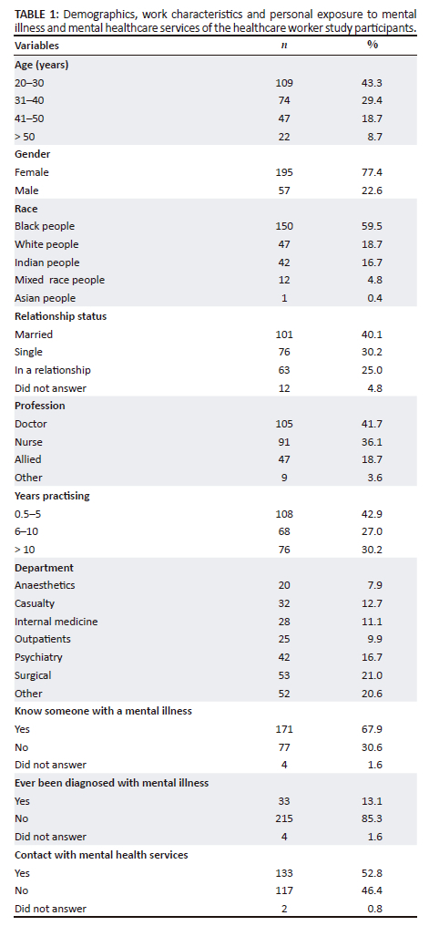 The majority of participants were in the 20-30 year old age group with 0-5 years of practising in their profession, most likely because of HJH being an academic training hospital, where many HCWs start their training and/or are busy pursuing their specialisation. Furthermore, the majority of HCWs were female, in keeping with a previous study of South African doctors which also found this demographic shift of an increasing number of females compared to males.20 Similarly, an Australian study conducted in 2021 showed that females comprised 76% of HCWs, including doctors, nurses and allied staff.21 Most participants in the current study were doctors, which could be because of selection bias as the primary researcher is a doctor, and therefore more doctors could have opted to participate. The highest proportion of participating HCWs were from the surgical department, which corresponds to this being a large department, followed by the 'other' departments (which may have pharmacists or allied HCWs who cover multiple departments) and then the psychiatry department, which is a smaller department in HJH. The latter finding might thus again indicate selection bias, as psychiatric staff may have been more open to conducting a survey in their line of work. Regarding personal exposure to mental illness, the majority of HCWs reported knowing someone with a mental illness, which is in keeping with a previous study on South African doctors.20 However, a minority of HCWs reported a personal diagnosis of a mental illness, which differs markedly from rates in the general population - locally and internationally. In the South African Stress and Health (SASH) study, the lifetime prevalence of mental illness was 30% and internationally it has been reported as 29%, which is more than double the rate reported in this study of HCWs.14,22 Multiple studies have also shown that mental illness is increasingly prevalent in HCWs because of a variety of compounding factors such as burnout, stress and compassion fatigue.23 Possible reasons for HCWs under-reporting their own mental illness include perceived stigma from colleagues, fear of being ostracised and over-reliance on self-treatment.23 Contact with mental health services was not explicitly defined for participants, but was included to assess their potential exposure to such services.