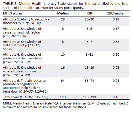 The overall MHLS scores in the current study (median 129) revealed moderate overall MHL with a broad range of responses with variability around the median (IQR 118-139). These results were similar to those found in a study on primary HCWs in SA and Zambia using the MHLS, with a mean of 122.17 In the current study, the scores of the different attributes of MHLS were similar overall, with neither the knowledge-related (attributes 1-5) nor attitude-related attributes (attribute 6) scoring markedly higher. In terms of variability around the median, the IQR/median ratio was calculated which showed the greatest variability of responses for the following attributes: knowledge-related attributes - knowledge of self-treatment (0.33), knowledge of professional help available (0.30) and knowledge of where to seek information (0.25); followed by the attitude-related attribute to promote recognition or appropriate help-seeking behaviour (0.23). Although not directly comparable, in the SA and Zambia study the co-efficient of variation (CV) was calculated, which is the standard deviation/mean ratio, and their findings were that there was a greater relative dispersion around the mean for the knowledge-related attributes, specifically: knowledge of causation and risk factors (CV 23% i.e. a ratio of 0.23), knowledge of self-treatment (0.23), knowledge of where to seek information (0.23).17