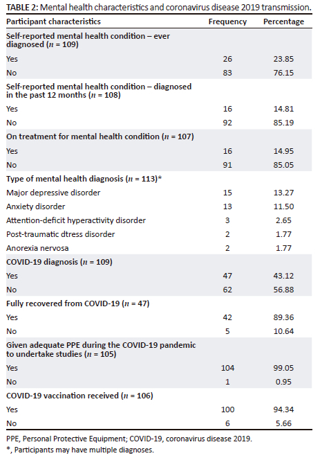 Just below half of the participants (43.12%) had been diagnosed with COVID-19 and most had fully recovered (89.36%). Most participants (99.05%) confirmed that they received adequate PPE to undertake academic and clinical duties during the COVID-19 pandemic. Most participants (94.34%) had also received the COVID-19 vaccination.