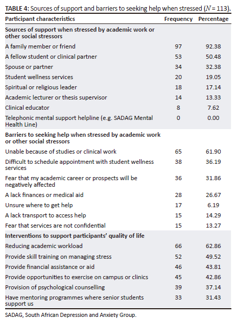 The online survey link consisted of an author-generated questionnaire that collected sociodemographic characteristics data on participants including age, gender, home background (urban or rural), marital status, employment status, current living situation, programme enrolled in and the year of study. Additionally, self-reported mental health history (including being diagnosed in the past 12 months and being on treatment for a mental health condition) was enquired about. Coronavirus disease 2019 specific questions included whether the participants were ever diagnosed with COVID-19, had fully recovered at the time of the study, had access to personal protective equipment (PPE) in the clinical platform or university premises, and whether they had received any COVID-19 vaccination. Substance use history was enquired about, including current use of cigarettes, tobacco, alcohol, illicit drugs and prescription medication. Participants were requested to additionally indicate if they ever felt the need to use substances to manage academic and social stressors. Finally, participants' sources of support for academic and social stressors, and barriers for seeking support when stressed were explored by offering students a multiple checklist, of which participants selected all that applied.