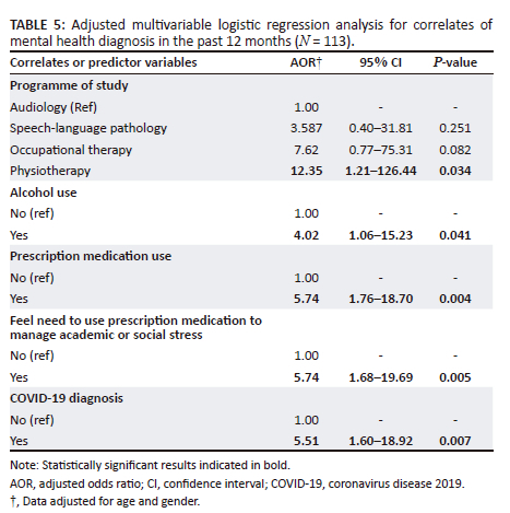Adjusted for age and gender, the multivariable logistic regression analysis (Table 5) revealed that a mental health diagnosis in the past 12 months was significantly associated with being enrolled in the physiotherapy programme (AOR [adjusted odds ratio] = 12.35, 1.21-126.44), alcohol use (AOR = 4.02, 1.06-15.23), prescription medication use (AOR = 5.74, 1.78-18.70), feeling the need to use prescription medication to manage academic or social stress (AOR = 5.74, 1.68-19.69), and having had a COVID-19 diagnosis (AOR = 5.51, 1.60-18.92). There were no other significant associations found.