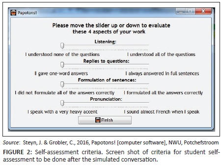 At the end of the simulated dialogue, an audio-recording of an individual modelling the successful completion of the activity is provided before the students are required to rate their performance in four areas on a sliding scale, thus adhering to the recommendations of Eisenmann & Summer (2012:418) to provide students 'with means of assessing their own performance'. Laurillard (2012:90) states that: