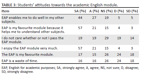 Table 3 also showed that 17% of the respondents agreed that they liked the academic English module, while 24% of the respondents disagreed with the statement that it was their favourite module, and 24% of the respondents were neutral in this regard. This finding contradicts most of the preceding findings, as the responses to the majority of the motivation-related questions point towards the respondents liking the module. Studying one's favourite module is supposed to be one of the factors that contributes towards becoming motivated to do well in the module.