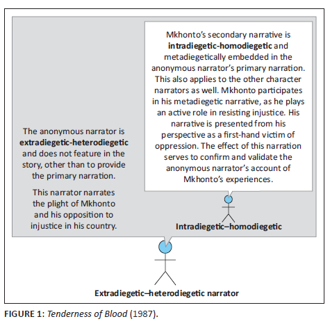 In Tenderness of Blood, the anonymous narrator's extradiegetic-heterodiegetic narration occupies fewer pages; it comprises approximately 40 per cent of the narrating time in the text compared to the secondary character-narrators' narration, which takes up as much as 60 per cent, including the narration of Mkhonto. Unlike the third-person narration, Mkhonto's narration provides personal information that the anonymous narrator does not have access to and which functions to register sympathy for the victimised characters. This is achieved when this kind of narration is inserted at a specific moment to supplement the primary narration.