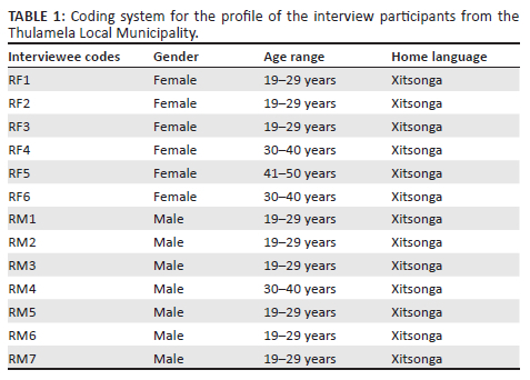 To determine the EV of Xitsonga in TLM, a purposive sampling technique was adopted to identify individuals who would be helpful in providing answers to the researchers (De Vos et al. 2013). Qualitative in approach, the study used face-to-face semi-structured interviews to collect the data. Thirteen (n = 13) Xitsonga L1 speakers (six females and seven males) aged 18 years and above from the TLM participated in the semi-structured interviews. The participants were divided into different age groups, that is 18-29 years, 30-40 years, 41-50 years, 51 years and above. Table 1 shows the coding system for interview participants' demographic profile.