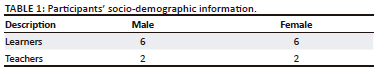 The sample consisted of 16 participants from two South African public high schools. The two schools were selected because they are the only two schools in Thembisa, Gauteng province, that teach Tshivenḓa as a subject. Twelve Grade 12 Tshivenḓa L1 learners, six from each school, and four teachers, two from each school, who teach Tshivenḓa as a subject were purposefully selected. We used purposive techniques to ensure the sample included Tshivenḓa-speaking Grade 12 learners and their teachers. This sampling technique is best suited as it is based on the researchers' judgement as to who is likely to provide the required information to achieve the objectives of the study (Kumar 2014). Table 1 provides the social demographic details of the participants.