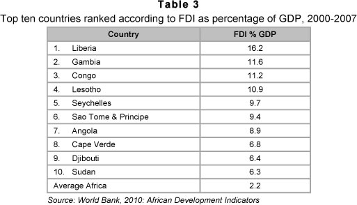 FDI as a percentage of gross fixed capital formation illustrates the importance of this source of investment for African countries (see Table 4 below). Angola topped the list primarily due to the inflow into oil extraction industries. Foreign investment in the majority of countries on the top ten list is also natural resource-driven, again dominated by oil exploration. With the exception of Nigeria (where FDI inflows are more diversified), the remainder of countries are classified as least developed countries.