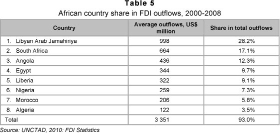 As stated earlier in the paper, a mere 1.8 per cent of developing country FDI outflows originate in African countries. Eight African countries have been the dominant source countries during the 2000-2008 period - see Table 5. Libyan Arab Jamahiriya is by far the largest and most prominent source country, with an outflow contribution of on average 28 per cent during the period 2000-2008. The country became particularly active as source country over the last three years. The majority of the outflows of the other African investor countries such as South Africa, Angola, Egypt and Liberia are directed at other African countries and, driven by the commodity market boom, investments are primarily aimed at natural resource exploration and the services sector. As was mentioned earlier, the latter sector appears to be experiencing an increase in inflows.