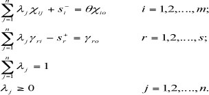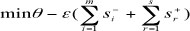 The input-orientated formula calculates input minimisation (where 9 indicates the efficiency score). Each observation, DMUj (j = 1, n), uses m inputs Xij (i = 1, 2,...m) to produce s outputs Yrj (r = 1, 2, ...,s), and where DMUo represents one of the n DMUs under evaluation, and Xio and Yro are the ith input and rth output for DMUo, respectively. In order to consider any slacks, the presence of the non-Archimedean e effectively allows the minimisation over θ to pre-empt the optimisation involving the slacks, si- and sr+. [For a more detailed discussion on the DEA methodology, see Cronje (2002), Avkiran (1999), Ray (2004) and Zhu (2004).]