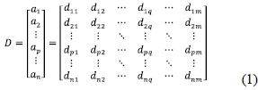 MCDA problems usually involve the ranking of a finite set of alternatives in terms of a finite number of decision criteria. Consider a decision problem with m criteria and n alternatives. Let c1,c2 ...,cm and a1,a2, ...,an denote the criteria and alternatives, respectively. The MCDA problem under consideration is depicted by a decision matrix of preferences shown in Eq. (1). The score dpqdescribes the performance of alternative apagainst criterion cq, where a higher score value means a better performance according to the goal of maximization.