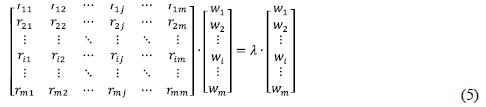By substituting the scoring data of the decision matrix into Eq. (4) to perform the Pearson distance correlation analysis in pairs, a proximity matrix of the similarity measures can be obtained. Using eigenvalue algorithms (see Section 2.2), a set of eigenvalues and their corresponding eigenvectors can be derived. By calculating the absolute values of the eigenvectors corresponding to the maximum eigenvalue, a set of the priorities of the principal diagonal components can be obtained. Further normalising these values, a set of weights corresponding to the criteria is elicited as: