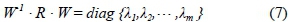 Eq. (6) can be written compactly as (R - λT) · W = 0, where I is the identity matrix. According to the eigen decomposition, the diagonal matrix constructed from the corresponding eigenvalues can be expressed as: