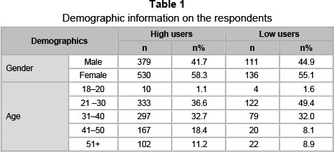 The results in Table 1 indicate that of the 909 high users of internet banking, 379 were males and 530 females. Of the 247 low users of internet banking, 111 were males and 136 females. The respondents in both cohorts also represented various age groups (see Table 1). In both clusters, the age categories 21-30 and 31-40 cumulatively represented more than 60 per cent of the respondents. Furthermore, both clusters also included respondents 51 years of age and older, making the sample of high and low users more representative of the general population of bank clients.