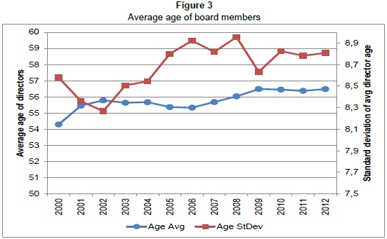 Figure 1 below shows that the average size of boards in the sample increased marginally from about 13 in 2000 to 14 in 2012. The standard deviation decreased over this period, indicating that board sizes in the sample varied less over time. The left vertical axis represents the average number of directors per board and the right vertical axis the standard deviation of the number of directors per board.