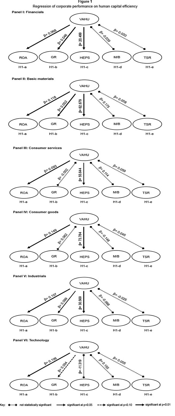 Given the large number of regressions performed, the regression results are presented diagrammatically in industry panels in Figure 1. For ease of reading, the regression outputs were limited to the β coefficients for VAHU - i.e. those which directly describe the impact of human capital efficiency on the dependent variables.