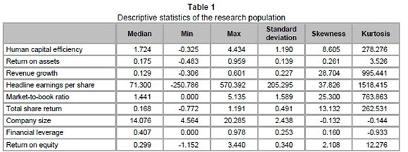 The descriptive statistics of the research population are presented in Table 1. While the median ROA was fairly high at 17.5%, the median VAHU clearly indicates that South African companies on the JSE were able to generate value from their human capital. The financial health of South African listed companies over the period under review appears to be strong, as the median TSR of 16.8% is much higher than the prime rate of interest in South Africa (which declined from 13% to 9% over the period) and the median GR of 12.9% is considerably higher than the target inflation rate of 3% to 6% over the period under review. Those favourable conditions translated into higher share valuations, attested by a median M/B greater than 1, despite the usual concerns surrounding emerging markets, such as weaker information environments, questionable corporate governance, lack of transparency and liquidity, and governmental corruption (Bruner, Conroy, Estrada, Kritzman & Li, 2002:319).