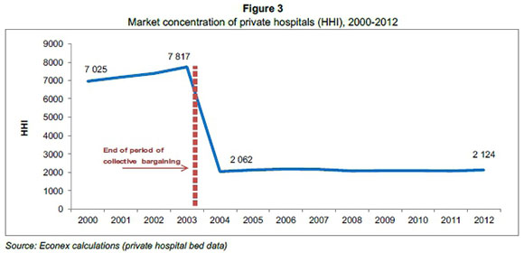 In this analysis, accordingly, all private hospital groups that negotiated collectively as HASA members prior to 2004 were grouped together when calculating the concentration level of the market at that time. After the prohibition of collective bargaining in 2004, the concentration level of the private hospitals was calculated considering each hospital group as a separate negotiating entity. The results of the latter calculations indicated a significant decrease in concentration in the private hospital market from 2003 to 2004, while after 2004 the concentration of the industry remained fairly constant.